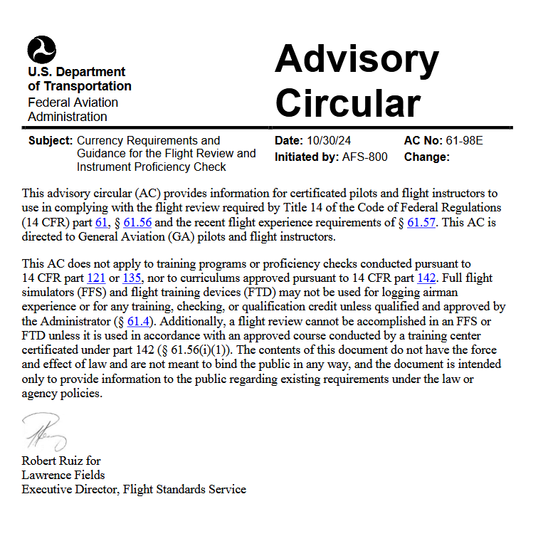The flight review will be conducted following the guidelines established in AC 61-98. See Appendices B, C, D, E, and F for the contents.